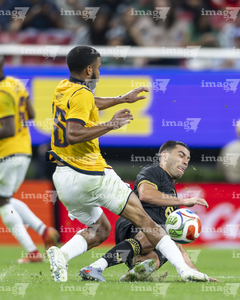 Zapopan, Jalisco, 14 de octubre de 2025. Erick Sánchez y Yaimar Medina, durante un partido amistoso del MEXTOUR 2025, entre la Selección Nacional de México y la Selección de Ecuador, realizado en el estadio Akron. Foto: Imago7/Sebastian Laureano Miranda