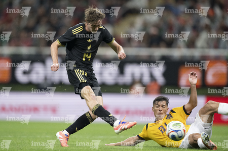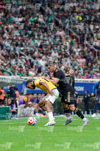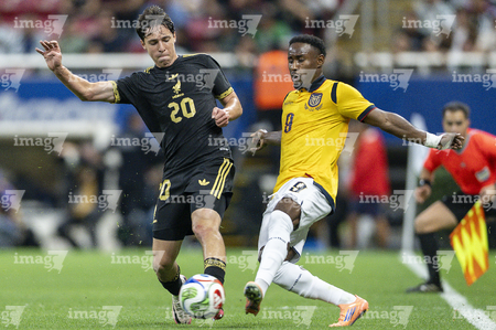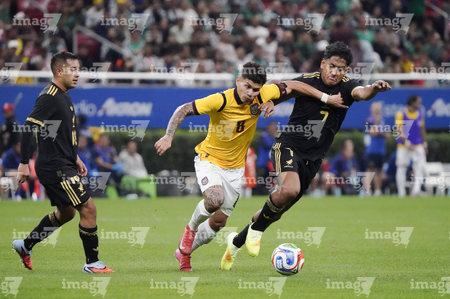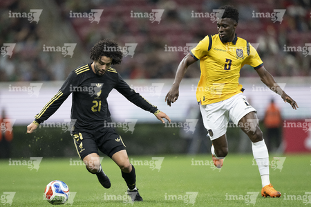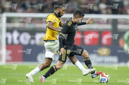 Zapopan, Jalisco, 14 de octubre de 2025. César Huerta "Chino" y Nilson Angulo, durante un partido amistoso del MEXTOUR 2025, entre la Selección Nacional de México y la Selección de Ecuador, realizado en el estadio Akron. Foto: Imago7/ Juan Carlos Cubeyro.