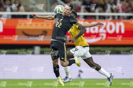 Zapopan, Jalisco, 14 de octubre de 2025. Yaimar Medina e Hirving Lozano "Chucky", durante un partido amistoso del MEXTOUR 2025, entre la Selección Nacional de México y la Selección de Ecuador, realizado en el estadio Akron. Foto: Imago7/ Juan Carlos Cubeyro.