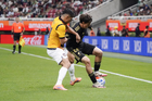Zapopan, Jalisco, 14 de octubre de 2025. Luis Romo y Jordy Alcívar, durante un partido amistoso del MEXTOUR 2025, entre la Selección Nacional de México y la Selección de Ecuador, realizado en el estadio Akron. Foto: Imago7/Sebastian Laureano Miranda