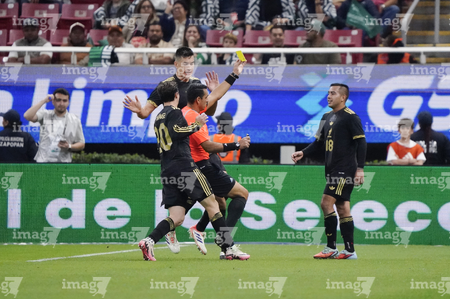 Zapopan, Jalisco, 14 de octubre de 2025. Juan Gabriel Calderón, árbitro central muestra tarjeta amarilla de amonestación a Erick Sánchez, durante un partido amistoso del MEXTOUR 2025, entre la Selección Nacional de México y la Selección de Ecuador, realizado en el estadio Akron. Foto: Imago7/