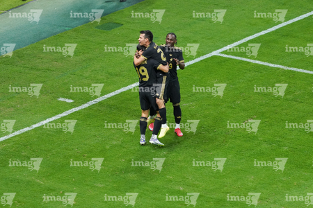 Zapopan, Jalisco, 14 de octubre de 2025. Julián Quiñones, Germán Berterame e Hirving Lozano "Chucky" en festejo de gol, durante un partido amistoso del MEXTOUR 2025, entre la Selección Nacional de México y la Selección de Ecuador, realizado en el estadio Akron. Foto: Imago7/ Alejandro Lias