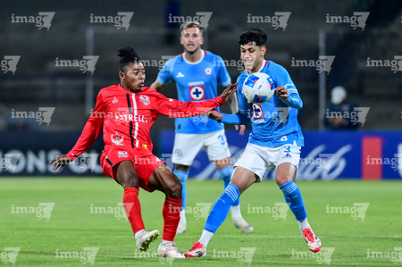 Ciudad de México, 11 de febrero de 2025. Angelo Exilus y Javier Suarez, durante el partido de vuelta de la primera ronda de la Champions Cup de la CONCACAF 2025, entre la Máquina Celeste del Cruz Azul y el Real Hope FA, celebrado en el estadio Olímpico Universitario. Foto: Imago7/ Alexis Chavez