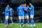 Ciudad de México, 11 de febrero de 2025. Ángel Sepúlveda y José Ignacio Rivero en festejo de gol, durante el partido de vuelta de la primera ronda de la Champions Cup de la CONCACAF 2025, entre la Máquina Celeste del Cruz Azul y el Real Hope FA, celebrado en el estadio Olímpico Universitario. Foto: Imago7/ Alexis Chavez
