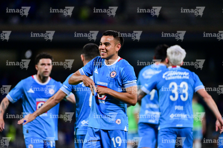 Ciudad de México, 11 de marzo de 2025. Ángel Sepúlveda, en festejo de gol durante el partido de vuelta de los Octavos de Final de la Champions Cup de la CONCACAF 2025, entre la Máquina Celeste del Cruz Azul y el Seattle Sounders, celebrado en el estadio Olímpico Universitario. Foto: Imago7/ Diego Padilla