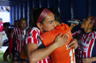 Cuernavaca, Morelos, 10 de enero de 2026. Victor Velazquez y Margarita Gonzalez, durante el partido correspondiente a la jornada 2 del torneo Clausura 2026 de la Liga BBVA MX Femenil, entre la Máquina Celeste del Cruz Azul y las Chivas Rayadas del Guadalajara, realizado en el estadio Centenario. Foto: Imago7/ Manlio Contreras