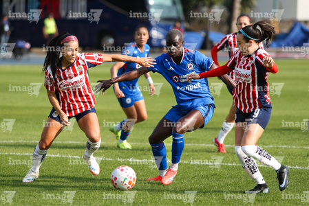 Cuernavaca, Morelos, 10 de enero de 2026. Cristina Ferral, Michaela Abam y Gabriela Valenzuela, durante el partido correspondiente a la jornada 2 del torneo Clausura 2026 de la Liga BBVA MX Femenil, entre la Máquina Celeste del Cruz Azul y las Chivas Rayadas del Guadalajara, realizado en el estadio Centenario. Foto: Imago7/ Daniel Sydney