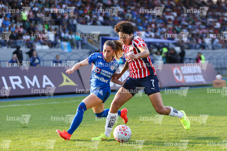 Cuernavaca, Morelos, 10 de enero de 2026. Ana Lucía Martínez y Alicia Cervantes, durante el partido correspondiente a la jornada 2 del torneo Clausura 2026 de la Liga BBVA MX Femenil, entre la Máquina Celeste del Cruz Azul y las Chivas Rayadas del Guadalajara, realizado en el estadio Centenario. Foto: Imago7/Carlos Vargas