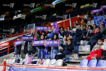 Pachuca, Hidalgo a 11 de enero de 2026. Afición con imagen de Mónica Ocampo, durante el partido correspondiente a la jornada 2 del torneo Clausura 2026 de la Liga BBVA MX Femenil, entre las Tuzas del Pachuca y el Club Querétaro, realizado en el estadio Hidalgo. Foto: Imago7/ Elizabeth Hernández