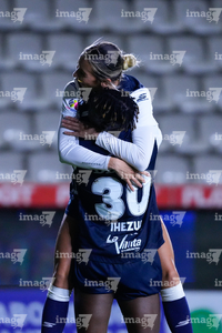 Pachuca, Hidalgo, 11 de enero de 2026. Chinwendu Ihezuo y Mónica Ocampo en festejo de gol, durante el partido correspondiente a la jornada 2 del torneo Clausura 2026 de la Liga BBVA MX Femenil, entre las Tuzas del Pachuca y el Club Querétaro, realizado en el estadio Hidalgo. Foto: Imago7/ Jacqueline Pedraza