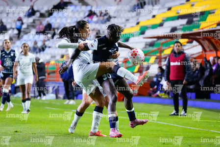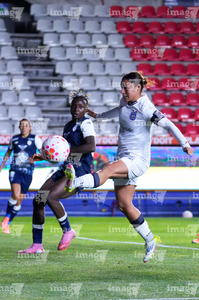 Pachuca, Hidalgo a 11 de enero de 2026. Vanessa González y Chinwendu Ihezuo, durante el partido correspondiente a la jornada 2 del torneo Clausura 2026 de la Liga BBVA MX Femenil, entre las Tuzas del Pachuca y el Club Querétaro, realizado en el estadio Hidalgo. Foto: Imago7/ Elizabeth Hernández