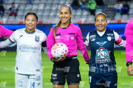 Pachuca, Hidalgo, 11 de enero de 2026. Vanessa González, María Fernanda Márquez, árbitra central y Mónica Ocampo, durante el partido correspondiente a la jornada 2 del torneo Clausura 2026 de la Liga BBVA MX Femenil, entre las Tuzas del Pachuca y el Club Querétaro, realizado en el estadio Hidalgo. Foto: Imago7/ Jacqueline Pedraza