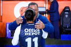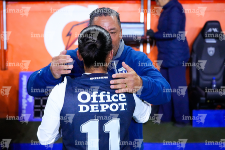 Pachuca, Hidalgo, 11 de enero de 2026. Mónica Ocampo y Óscar Torres, director técnico, durante el partido correspondiente a la jornada 2 del torneo Clausura 2026 de la Liga BBVA MX Femenil, entre las Tuzas del Pachuca y el Club Querétaro, realizado en el estadio Hidalgo. Foto: Imago7/ Jacqueline Pedraza