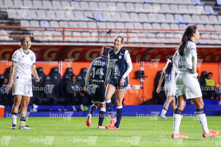 Pachuca, Hidalgo a 11 de enero de 2026. Gabriela Álvarez y Charlyn Corral, durante el partido correspondiente a la jornada 2 del torneo Clausura 2026 de la Liga BBVA MX Femenil, entre las Tuzas del Pachuca y el Club Querétaro, realizado en el estadio Hidalgo. Foto: Imago7/ Elizabeth Hernández
