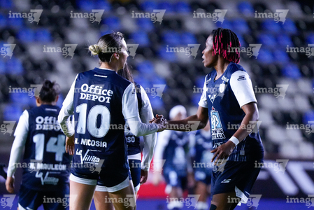 Pachuca, Hidalgo, 11 de enero de 2026. Mónica Ocampo y Jocelyn Orejel, durante el partido correspondiente a la jornada 2 del torneo Clausura 2026 de la Liga BBVA MX Femenil, entre las Tuzas del Pachuca y el Club Querétaro, realizado en el estadio Hidalgo. Foto: Imago7/ Jacqueline Pedraza