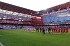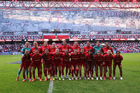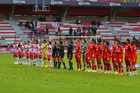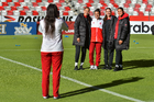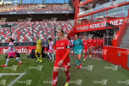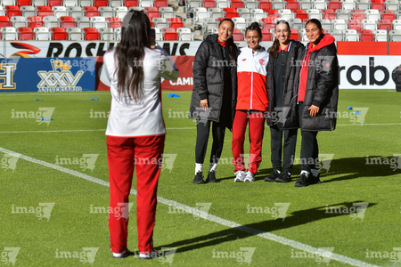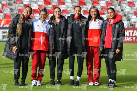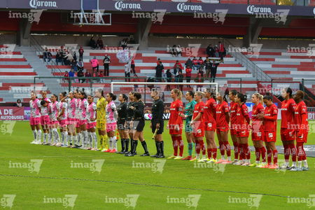 Toluca, Estado de México, 12 de enero de 2026. Protocolo, durante el partido correspondiente a la jornada 2 del torneo Clausura 2026 de la Liga BBVA MX Femenil, entre las Diablas Rojas del Toluca y las Rojinegras del Atlas, realizado en el estadio Nemesio Diez. Foto: Imago7/Jesús Esquivel