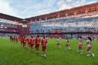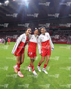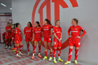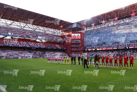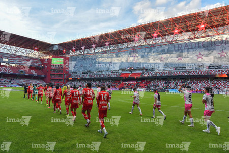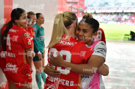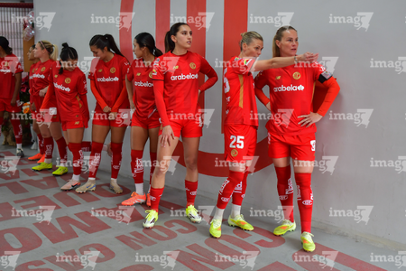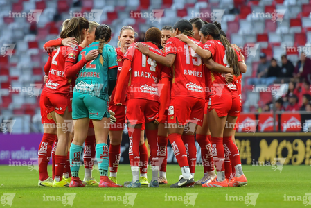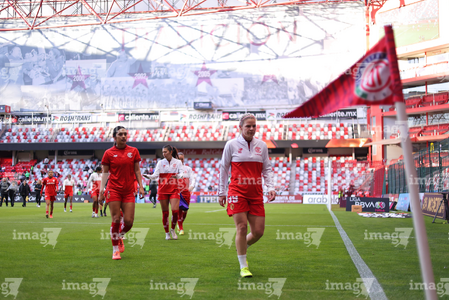Toluca, Estado de México, 12 de enero de 2026. Protocolo, durante el partido correspondiente a la jornada 2 del torneo Clausura 2026 de la Liga BBVA MX Femenil, entre las Diablas Rojas del Toluca y las Rojinegras del Atlas, realizado en el estadio Nemesio Diez. Foto: Imago7/ Arturo Hernández