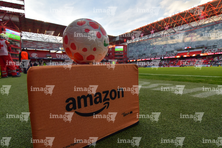 Toluca, Estado de México, 12 de enero de 2026. Balón de futbol Nike Control con caja de Amazon, durante el partido correspondiente a la jornada 2 del torneo Clausura 2026 de la Liga BBVA MX Femenil, entre las Diablas Rojas del Toluca y las Rojinegras del Atlas, realizado en el estadio Nemesio Diez. Foto: Imago7/ Arturo Hernández