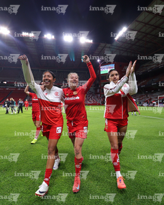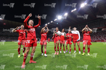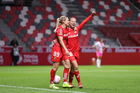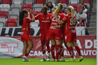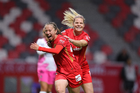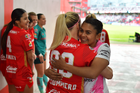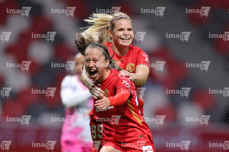 Toluca, Estado de México, 12 de enero de 2026. Itzel Muñoz y Eugenie Le Sommer en festejo de gol, durante el partido correspondiente a la jornada 2 del torneo Clausura 2026 de la Liga BBVA MX Femenil, entre las Diablas Rojas del Toluca y las Rojinegras del Atlas, realizado en el estadio Nemesio Diez. Foto: Imago7/Jesús Esquivel