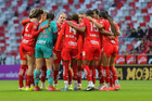 Toluca, Estado de México, 12 de enero de 2026. Jugadoras del Toluca femenil, durante el partido correspondiente a la jornada 2 del torneo Clausura 2026 de la Liga BBVA MX Femenil, entre las Diablas Rojas del Toluca y las Rojinegras del Atlas, realizado en el estadio Nemesio Diez. Foto: Imago7/Jesús Esquivel