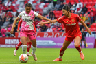 Toluca, Estado de México, 12 de enero de 2026. Ashley López y Natalia Macías, durante el partido correspondiente a la jornada 2 del torneo Clausura 2026 de la Liga BBVA MX Femenil, entre las Diablas Rojas del Toluca y las Rojinegras del Atlas, realizado en el estadio Nemesio Diez. Foto: Imago7/Daniel Arriaga