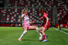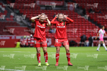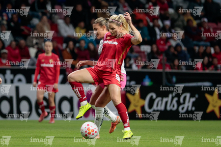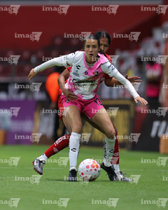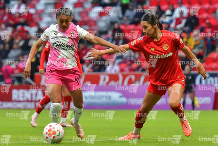 Toluca, Estado de México, 12 de enero de 2026. Kayla Fernandez y Ashley López, durante el partido correspondiente a la jornada 2 del torneo Clausura 2026 de la Liga BBVA MX Femenil, entre las Diablas Rojas del Toluca y las Rojinegras del Atlas, realizado en el estadio Nemesio Diez. Foto: Imago7/ Arturo Hernández