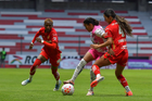 Toluca, Estado de México, 12 de enero de 2026. Deneisha Blackwood y Laila Saravia, durante el partido correspondiente a la jornada 2 del torneo Clausura 2026 de la Liga BBVA MX Femenil, entre las Diablas Rojas del Toluca y las Rojinegras del Atlas, realizado en el estadio Nemesio Diez. Foto: Imago7/Jesús Esquivel