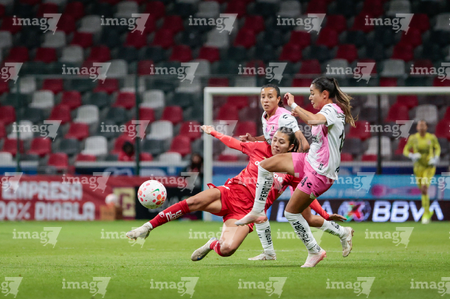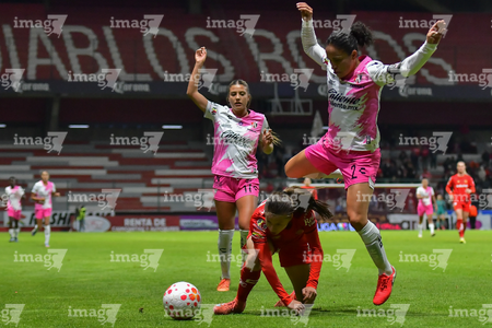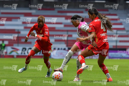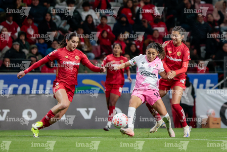 Toluca, Estado de México, 12 de enero de 2026. Brenda Diaz, Itzel Muñoz y Yaneisy Rodríguez, durante el partido correspondiente a la jornada 2 del torneo Clausura 2026 de la Liga BBVA MX Femenil, entre las Diablas Rojas del Toluca y las Rojinegras del Atlas, realizado en el estadio Nemesio Diez. Foto: Imago7/Jesús Esquivel