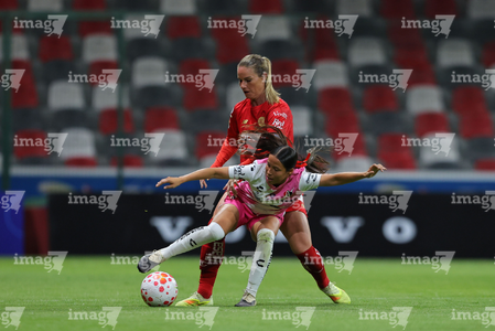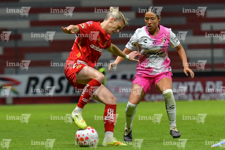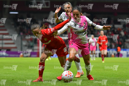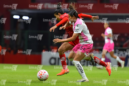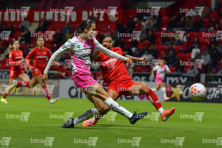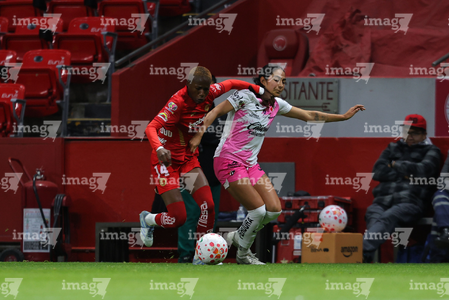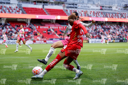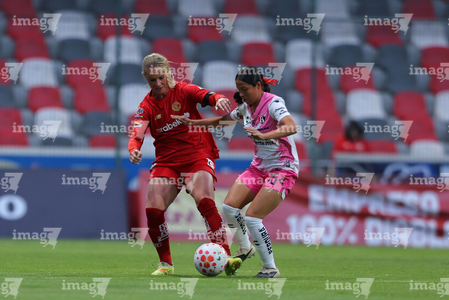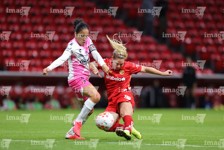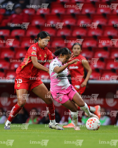 Toluca, Estado de México, 12 de enero de 2026. Dirce Delgado y Kayla Fernandez, durante el partido correspondiente a la jornada 2 del torneo Clausura 2026 de la Liga BBVA MX Femenil, entre las Diablas Rojas del Toluca y las Rojinegras del Atlas, realizado en el estadio Nemesio Diez. Foto: Imago7/Daniel Arriaga