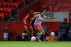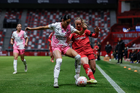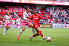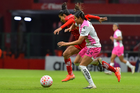 Toluca, Estado de México, 12 de enero de 2026. Eugenie Le Sommer y Brenda Ceren, durante el partido correspondiente a la jornada 2 del torneo Clausura 2026 de la Liga BBVA MX Femenil, entre las Diablas Rojas del Toluca y las Rojinegras del Atlas, realizado en el estadio Nemesio Diez. Foto: Imago7/ Arturo Hernández