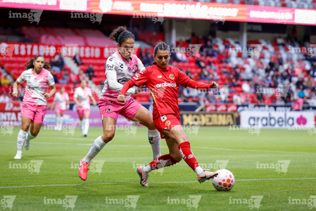 Toluca, Estado de México, 12 de enero de 2026. Mitsy Ramírez y Brenda Ceren, durante el partido correspondiente a la jornada 2 del torneo Clausura 2026 de la Liga BBVA MX Femenil, entre las Diablas Rojas del Toluca y las Rojinegras del Atlas, realizado en el estadio Nemesio Diez. Foto: Imago7/Jesús Esquivel