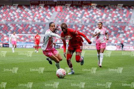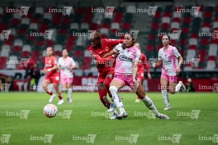 Toluca, Estado de México, 12 de enero de 2026. Deneisha Blackwood y Laila Saravia, durante el partido correspondiente a la jornada 2 del torneo Clausura 2026 de la Liga BBVA MX Femenil, entre las Diablas Rojas del Toluca y las Rojinegras del Atlas, realizado en el estadio Nemesio Diez. Foto: Imago7/