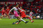 Toluca, Estado de México, 12 de enero de 2026. Itzel Muñoz anota gol, durante el partido correspondiente a la jornada 2 del torneo Clausura 2026 de la Liga BBVA MX Femenil, entre las Diablas Rojas del Toluca y las Rojinegras del Atlas, realizado en el estadio Nemesio Diez. Foto: Imago7/