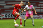 Toluca, Estado de México, 12 de enero de 2026. Dirce Delgado y Eugenie Le Sommer, durante el partido correspondiente a la jornada 2 del torneo Clausura 2026 de la Liga BBVA MX Femenil, entre las Diablas Rojas del Toluca y las Rojinegras del Atlas, realizado en el estadio Nemesio Diez. Foto: Imago7/Jesús Esquivel