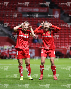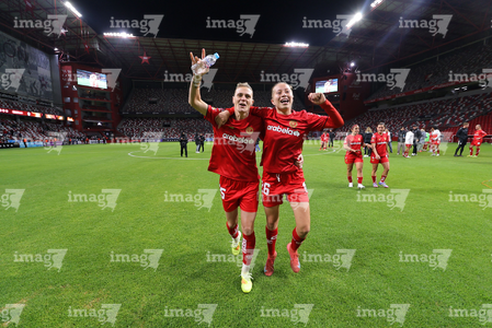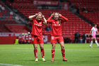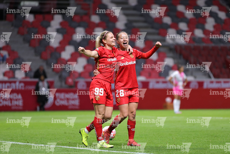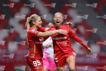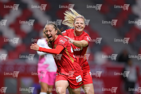 Toluca, Estado de México, 12 de enero de 2026. Eugenie Le Sommer e Itzel Muñoz en festejo de gol, durante el partido correspondiente a la jornada 2 del torneo Clausura 2026 de la Liga BBVA MX Femenil, entre las Diablas Rojas del Toluca y las Rojinegras del Atlas, realizado en el estadio Nemesio Diez. Foto: Imago7/Jesús Esquivel