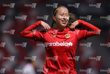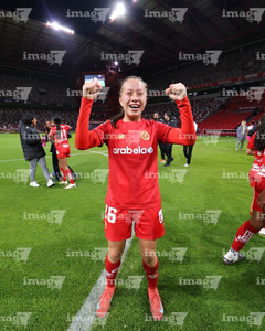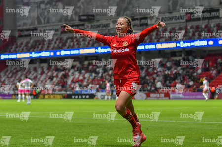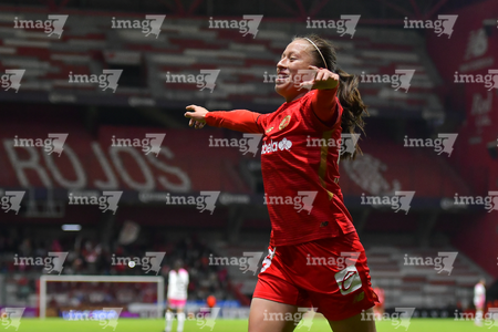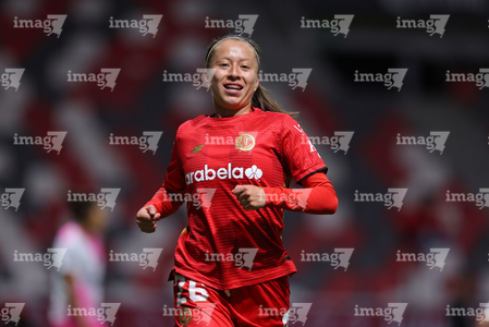 Toluca, Estado de México, 12 de enero de 2026. Itzel Muñoz en festejo de gol, durante el partido correspondiente a la jornada 2 del torneo Clausura 2026 de la Liga BBVA MX Femenil, entre las Diablas Rojas del Toluca y las Rojinegras del Atlas, realizado en el estadio Nemesio Diez. Foto: Imago7/ Arturo Hernández
