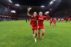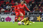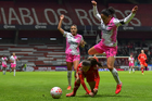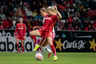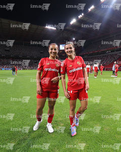 Toluca, Estado de México, 12 de enero de 2026. Faustine Robert y Amandine Henry, durante el partido correspondiente a la jornada 2 del torneo Clausura 2026 de la Liga BBVA MX Femenil, entre las Diablas Rojas del Toluca y las Rojinegras del Atlas, realizado en el estadio Nemesio Diez. Foto: Imago7/ Arturo Hernández
