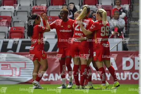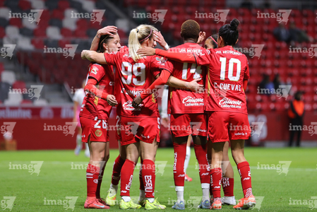 Toluca, Estado de México, 12 de enero de 2026. Jugadoras del Toluca femenil en festejo de gol, durante el partido correspondiente a la jornada 2 del torneo Clausura 2026 de la Liga BBVA MX Femenil, entre las Diablas Rojas del Toluca y las Rojinegras del Atlas, realizado en el estadio Nemesio Diez. Foto: Imago7/Jesús Esquivel
