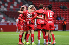 Toluca, Estado de México, 12 de enero de 2026. Jugadoras del Toluca femenil en festejo de gol, durante el partido correspondiente a la jornada 2 del torneo Clausura 2026 de la Liga BBVA MX Femenil, entre las Diablas Rojas del Toluca y las Rojinegras del Atlas, realizado en el estadio Nemesio Diez. Foto: Imago7/ Arturo Hernández