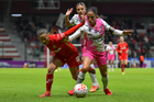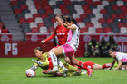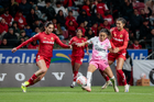 Toluca, Estado de México, 12 de enero de 2026. Eugenie Le Sommer y Ashley López, durante el partido correspondiente a la jornada 2 del torneo Clausura 2026 de la Liga BBVA MX Femenil, entre las Diablas Rojas del Toluca y las Rojinegras del Atlas, realizado en el estadio Nemesio Diez. Foto: Imago7/Daniel Arriaga