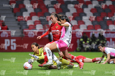 Toluca, Estado de México, 12 de enero de 2026. Casandra Cuevas y Noemí Villalobos, durante el partido correspondiente a la jornada 2 del torneo Clausura 2026 de la Liga BBVA MX Femenil, entre las Diablas Rojas del Toluca y las Rojinegras del Atlas, realizado en el estadio Nemesio Diez. Foto: Imago7/ Arturo Hernández