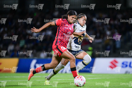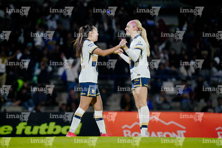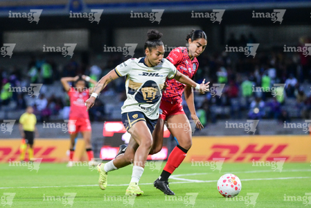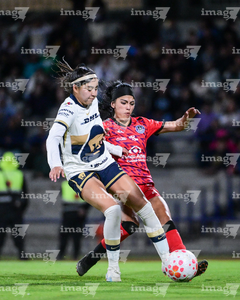 Ciudad de México, 16 de enero de 2026. Karen Ramírez y Ambar González, durante el partido correspondiente a la jornada 3 del torneo Clausura 2026 de la Liga BBVA MX Femenil, entre las Pumas de la UNAM y las Cañoneras del Mazatlán FC, realizado en el estadio Olímpico Universitario. Foto: Imago7/ Alexis Chavez