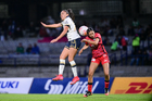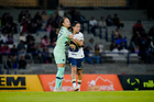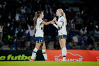 Ciudad de México, 16 de enero de 2026. Karen Ramírez y Daniela Solera, durante el partido correspondiente a la jornada 3 del torneo Clausura 2026 de la Liga BBVA MX Femenil, entre las Pumas de la UNAM y las Cañoneras del Mazatlán FC, realizado en el estadio Olímpico Universitario. Foto: Imago7/ Alexis Chavez