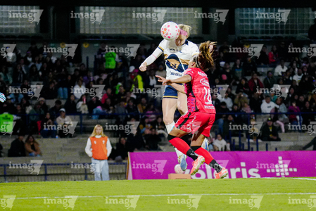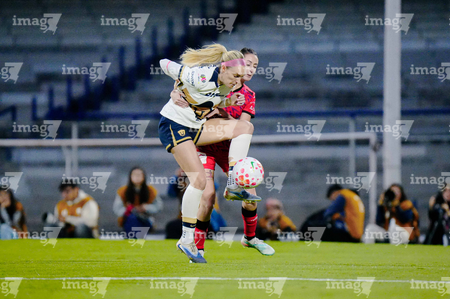 Ciudad de México, 16 de enero de 2026. Montserrat Hernández y Paulina Ramos, durante el partido correspondiente a la jornada 3 del torneo Clausura 2026 de la Liga BBVA MX Femenil, entre las Pumas de la UNAM y las Cañoneras del Mazatlán FC, realizado en el estadio Olímpico Universitario. Foto: Imago7/ Alexis Chavez