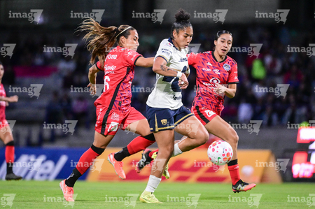 Ciudad de México, 16 de enero de 2026. Karen De León, durante el partido correspondiente a la jornada 3 del torneo Clausura 2026 de la Liga BBVA MX Femenil, entre las Pumas de la UNAM y las Cañoneras del Mazatlán FC, realizado en el estadio Olímpico Universitario. Foto: Imago7/ Alexis Chavez