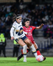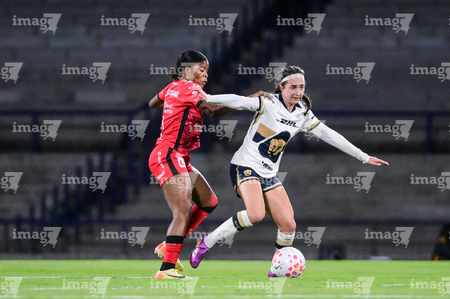 Ciudad de México, 16 de enero de 2026. Nayely Bolaños y Vasthy Delgado, durante el partido correspondiente a la jornada 3 del torneo Clausura 2026 de la Liga BBVA MX Femenil, entre las Pumas de la UNAM y las Cañoneras del Mazatlán FC, realizado en el estadio Olímpico Universitario. Foto: Imago7/ Alexis Chavez
