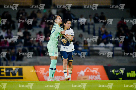Ciudad de México, 16 de enero de 2026. Guadalupe Sánchez y Nayely Bolaños, durante el partido correspondiente a la jornada 3 del torneo Clausura 2026 de la Liga BBVA MX Femenil, entre las Pumas de la UNAM y las Cañoneras del Mazatlán FC, realizado en el estadio Olímpico Universitario. Foto: Imago7/ Alexis Chavez