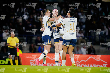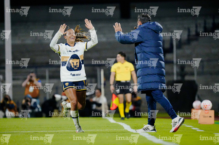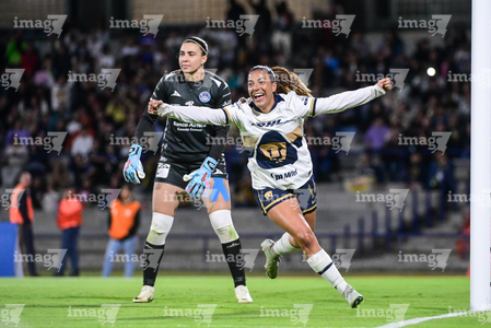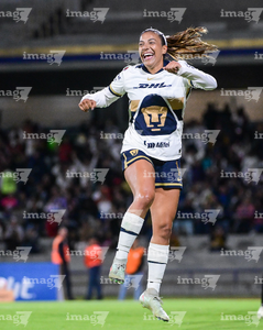 Ciudad de México, 16 de enero de 2026. Angelina Hix en festejo de gol, durante el partido correspondiente a la jornada 3 del torneo Clausura 2026 de la Liga BBVA MX Femenil, entre las Pumas de la UNAM y las Cañoneras del Mazatlán FC, realizado en el estadio Olímpico Universitario. Foto: Imago7/ Alexis Chavez