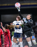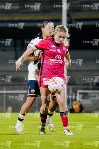 Ciudad de México, 16 de enero de 2026. Angelina Hix y Lucy Ortiz, durante el partido correspondiente a la jornada 3 del torneo Clausura 2026 de la Liga BBVA MX Femenil, entre las Pumas de la UNAM y las Cañoneras del Mazatlán FC, realizado en el estadio Olímpico Universitario. Foto: Imago7/ Diego Padilla