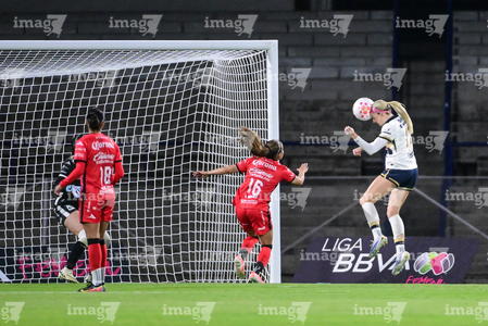 Ciudad de México, 16 de enero de 2026. Angelina Hix anota gol, durante el partido correspondiente a la jornada 3 del torneo Clausura 2026 de la Liga BBVA MX Femenil, entre las Pumas de la UNAM y las Cañoneras del Mazatlán FC, realizado en el estadio Olímpico Universitario. Foto: Imago7/ Diego Padilla